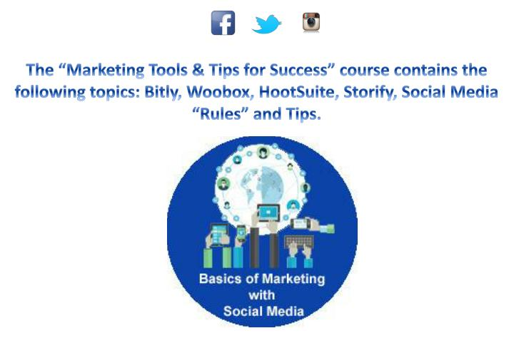 The "Basics of Marketing with Social Media" course includes the following topics: Social Media Introduction, Creating an Google Account, Setting Up Your Twitter Account, Getting Your Twitter House in Order, Why Facebook for Your Business?, Using Facebook as a Business, Setting Up Your Business Page, Setting Your Cover Photo, Tying It All Together.